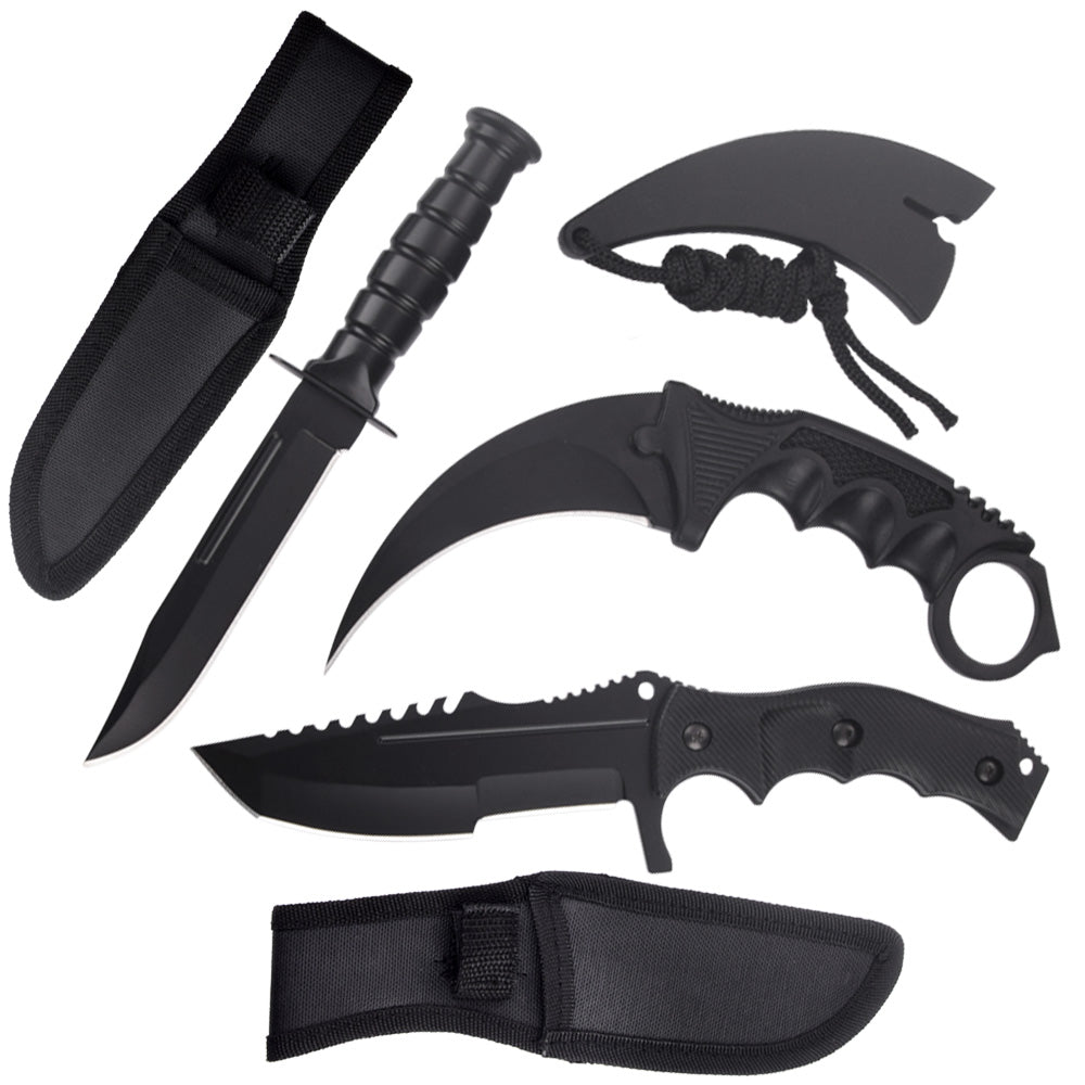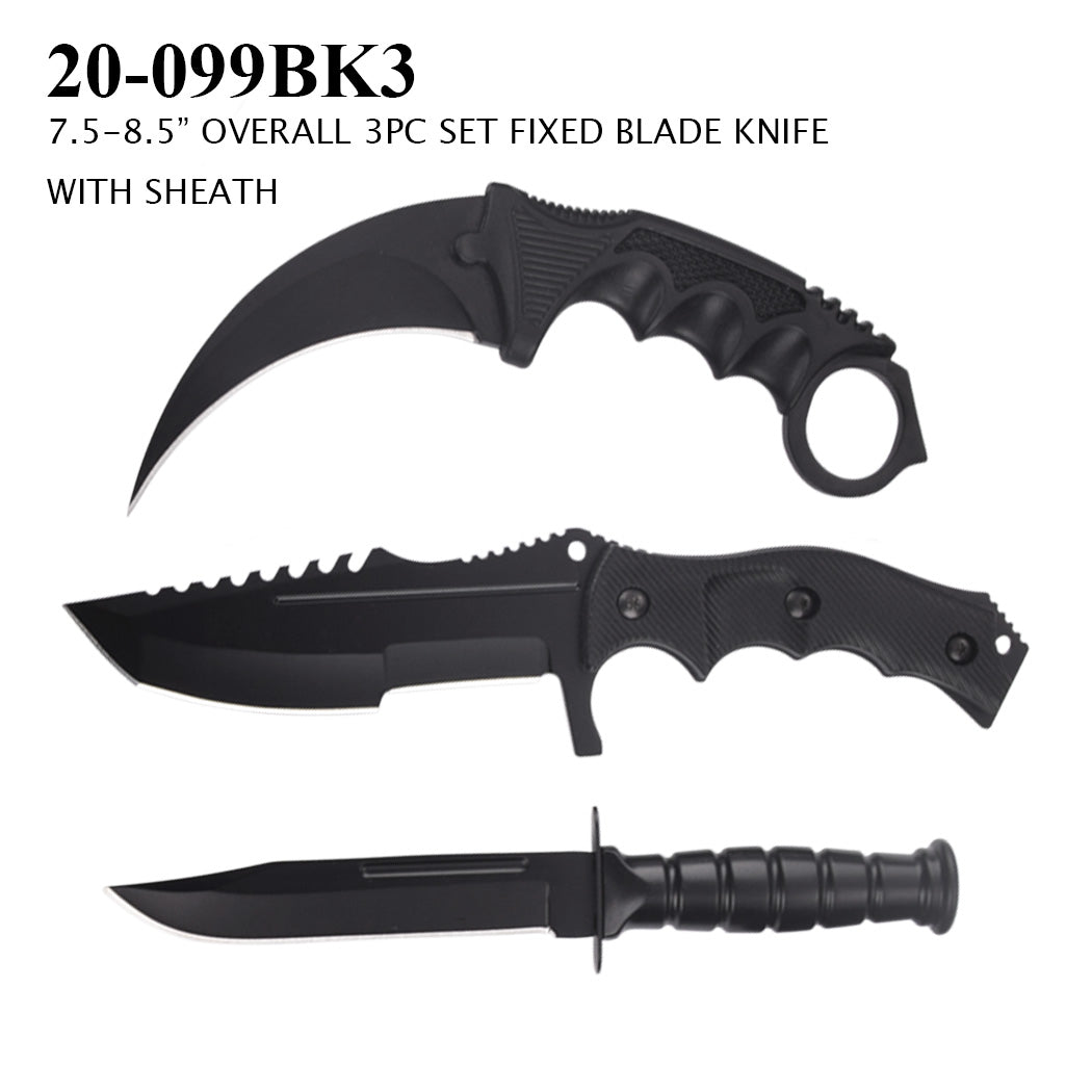 3 Piece Set Fixed Blade Knives w/Sheaths 7.5"- 8.5" Black Stainless-Steel Blades/Black ABS Handles SKU 20-099BK3