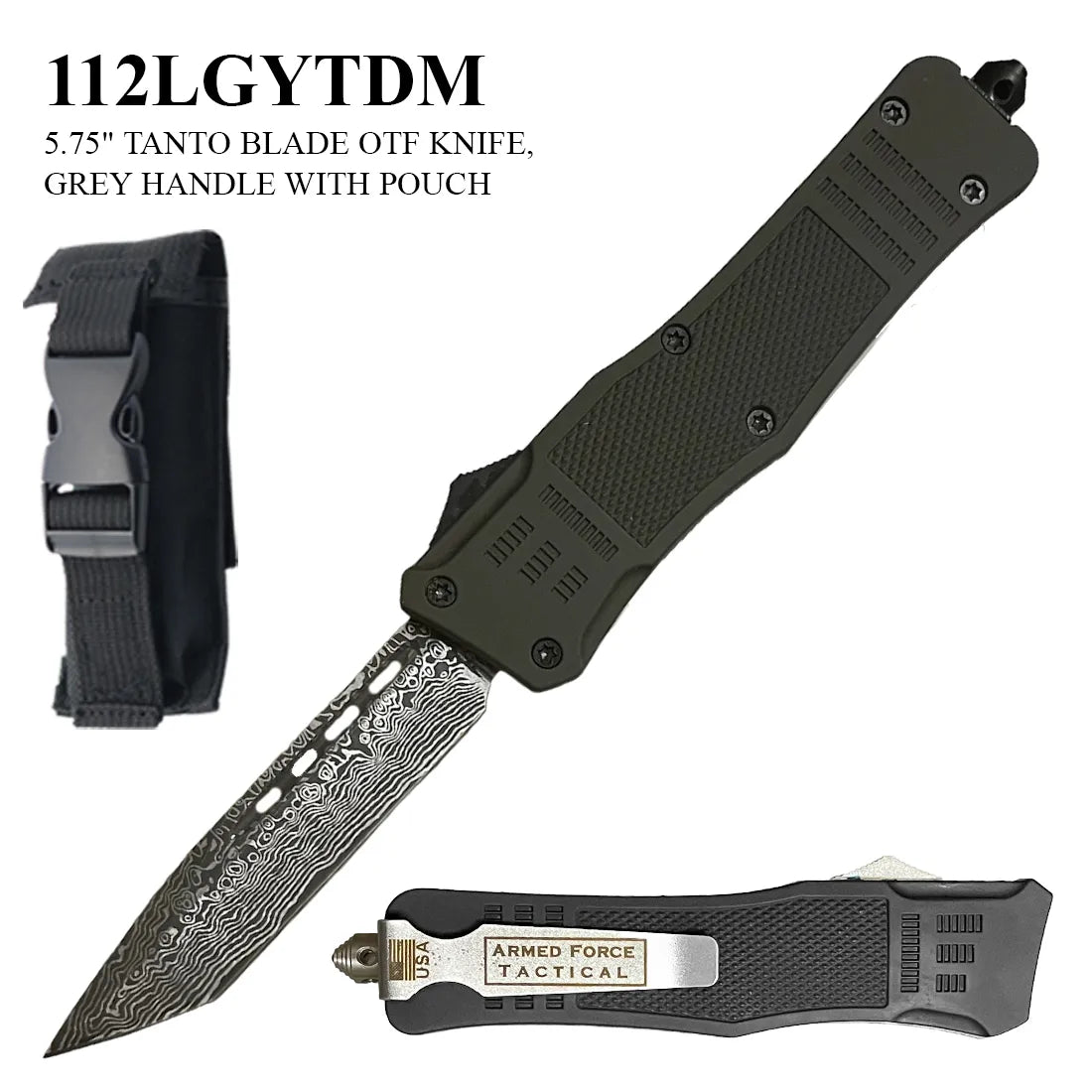 Armed Force Auto. OTF Knife w/Sheath Damascus Etched Tanto SS Blade/Gray Handle SKU 112LGYTDM