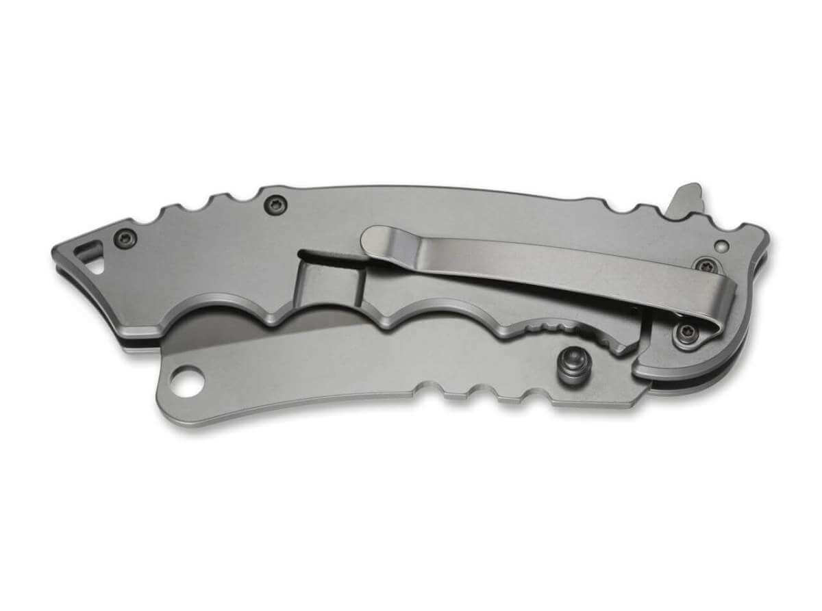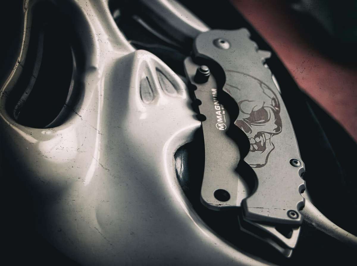 Boker Magnum Mortem Frame Lock Knife Gray 440A Stainless-Steel Cleaver Blade/Gray Stainless-Steel Handle with Skull SKU 01RY217