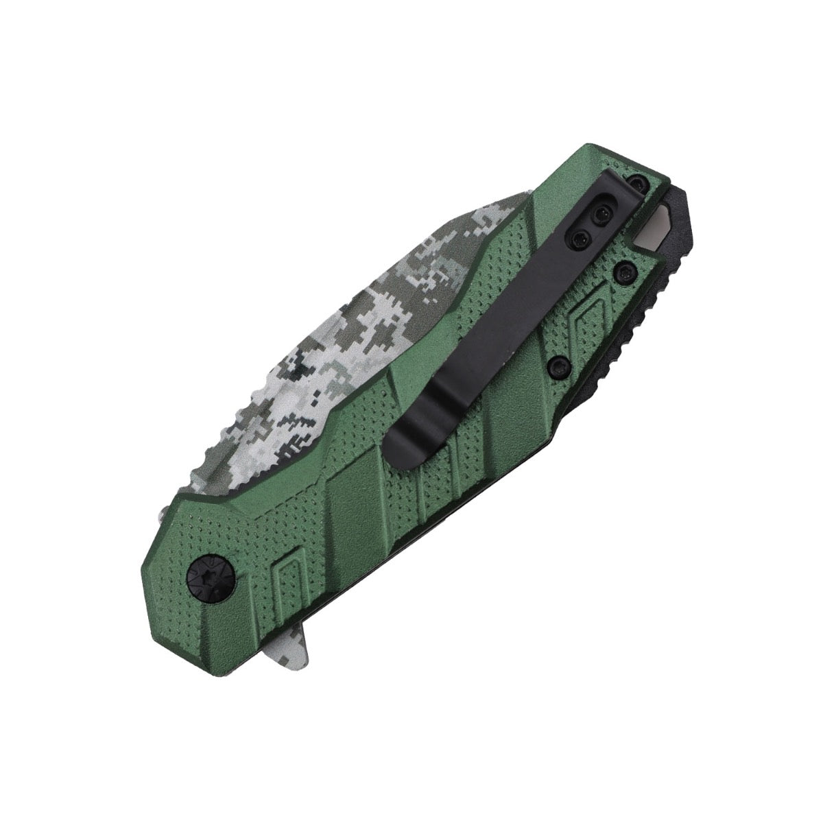 Tac Force Spring Assist Knife Digital Camo Embossed 3Cr13 Steel Blade/Green Alum. Handle SKU TF-1049GN