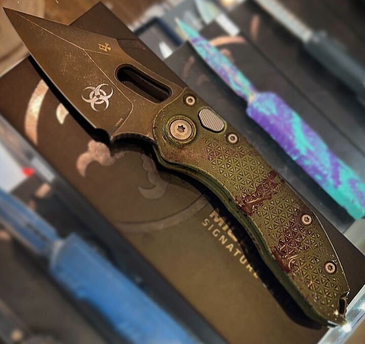 Microtech Stich Standard Outbreak Automatic Knife Bohler M390 Steel Blade/Green Splatter Aluminum Handle SKU 169-10BS