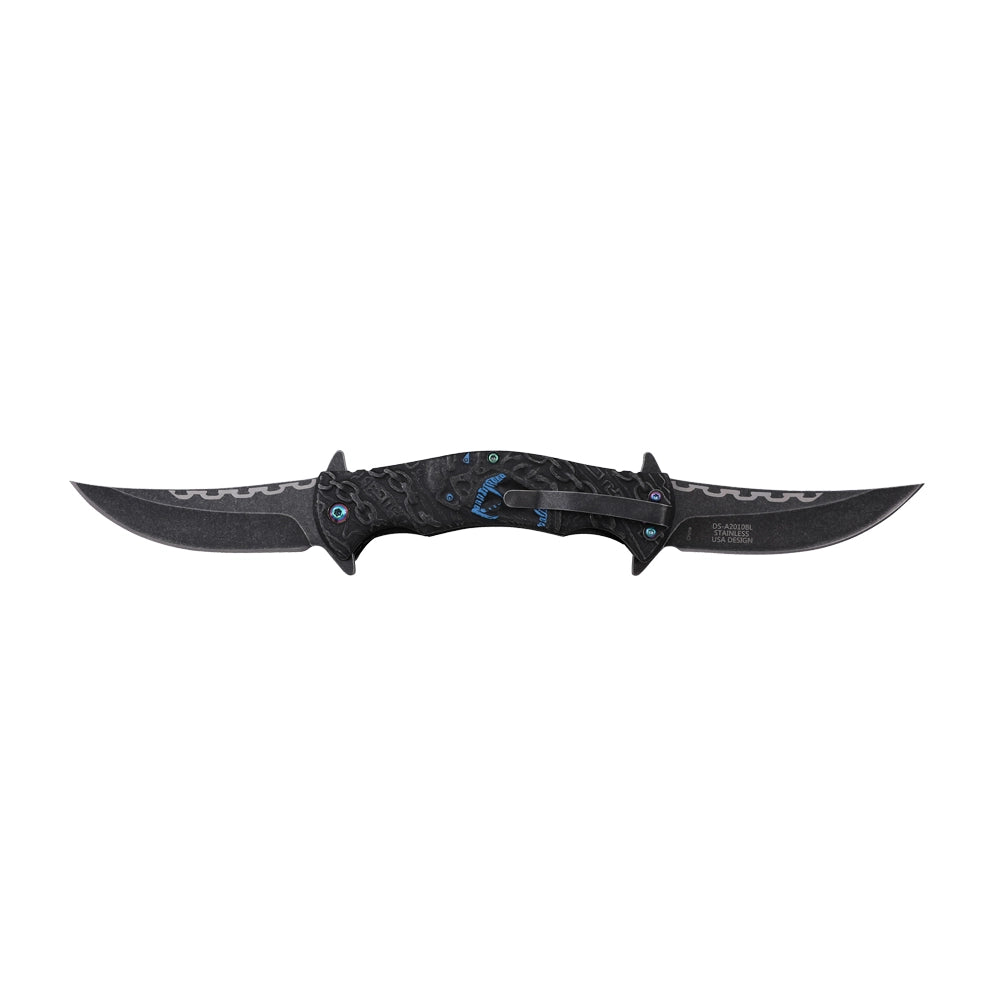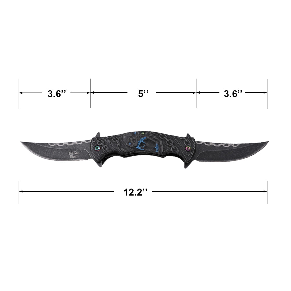 Dark Side Blades Spring Assist Double Bladed Liner Lock Knife Black 3Cr13MoV Steel Blades/Black Stainless-Steel Handle with Skull & Chains (Blue) SKU DS-A2010BL