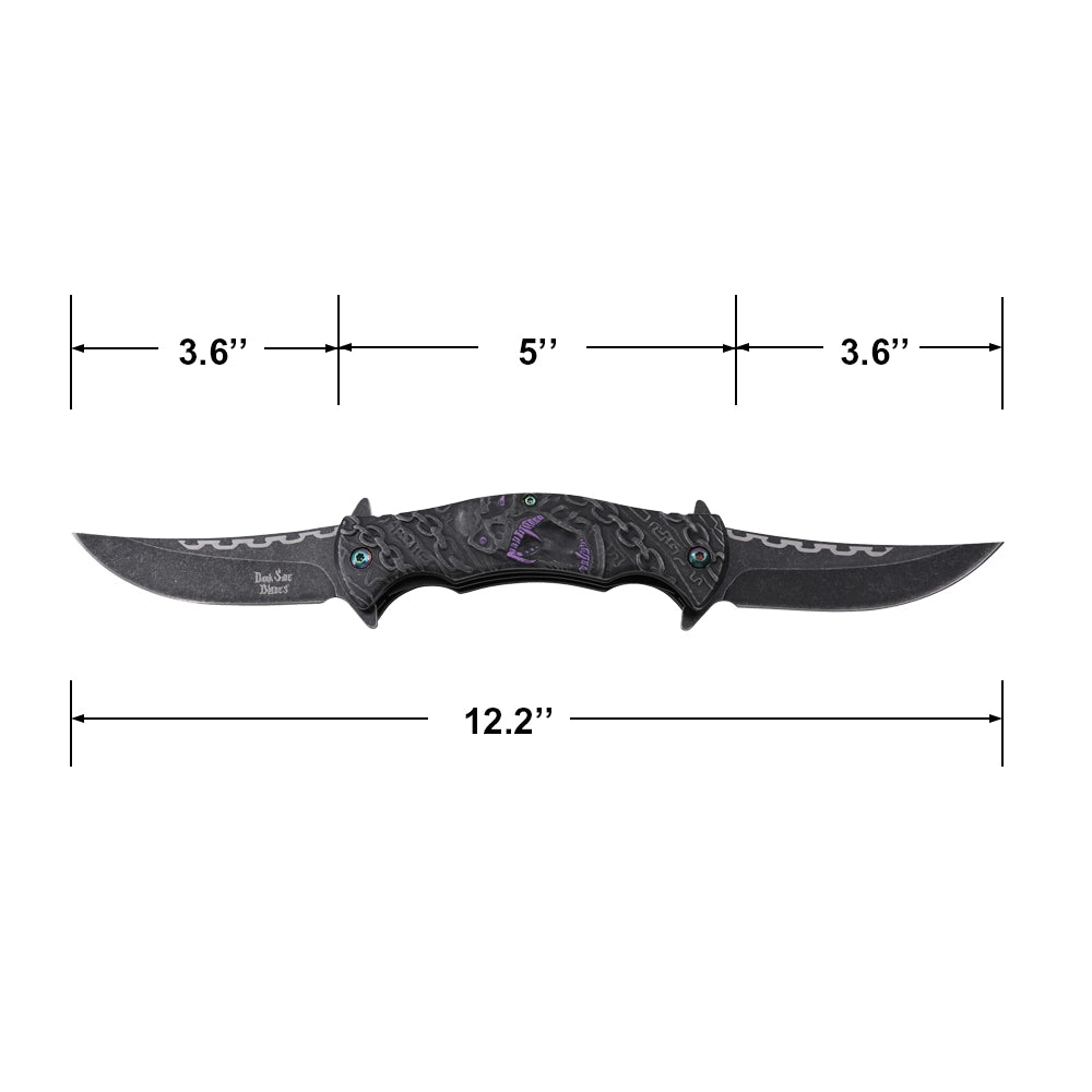 Dark Side Blades Spring Assist Double Bladed Liner Lock Knife Black 3Cr13MoV Steel Blades/Black Stainless-Steel Handle with Skull & Chains (Purple) SKU DS-A2010PL