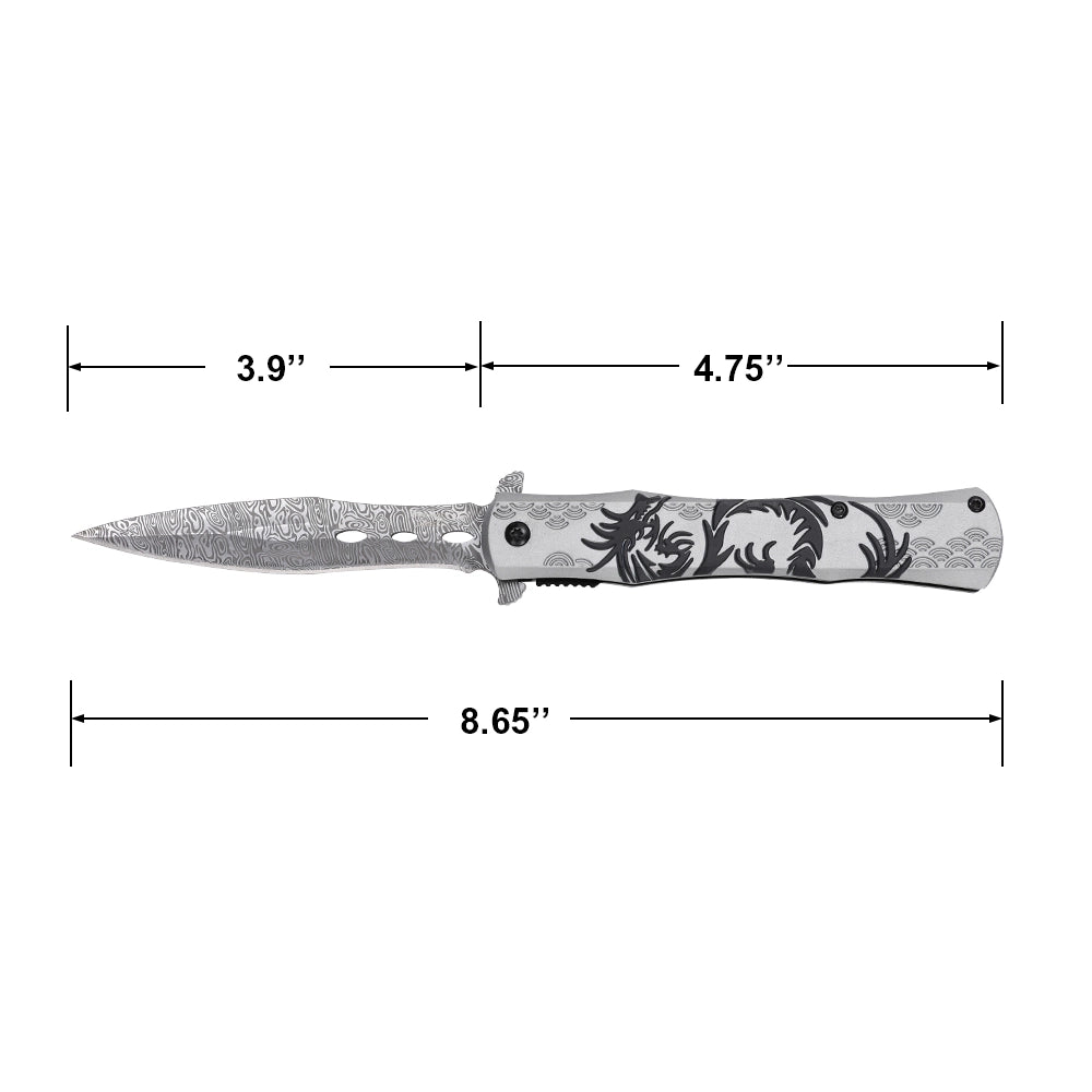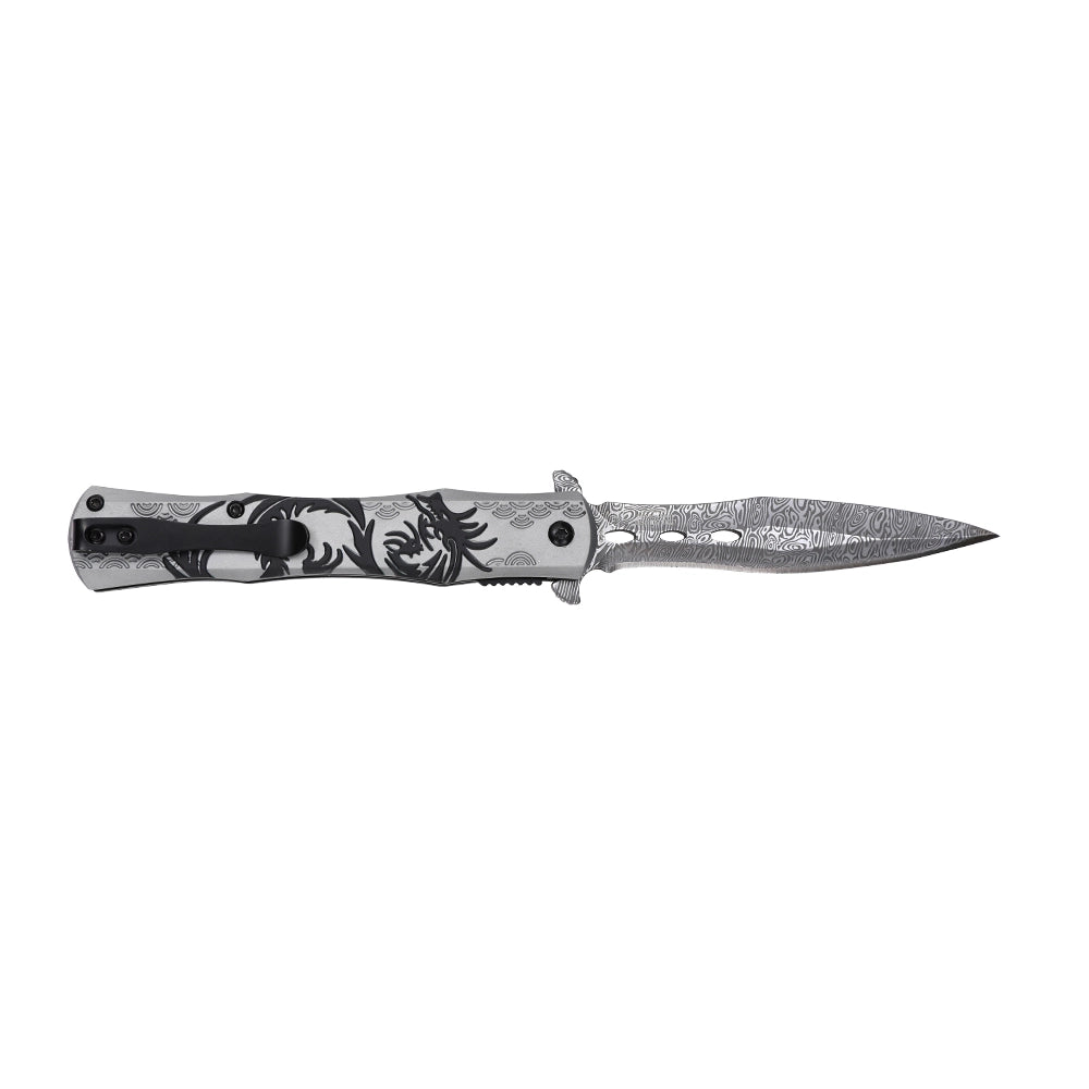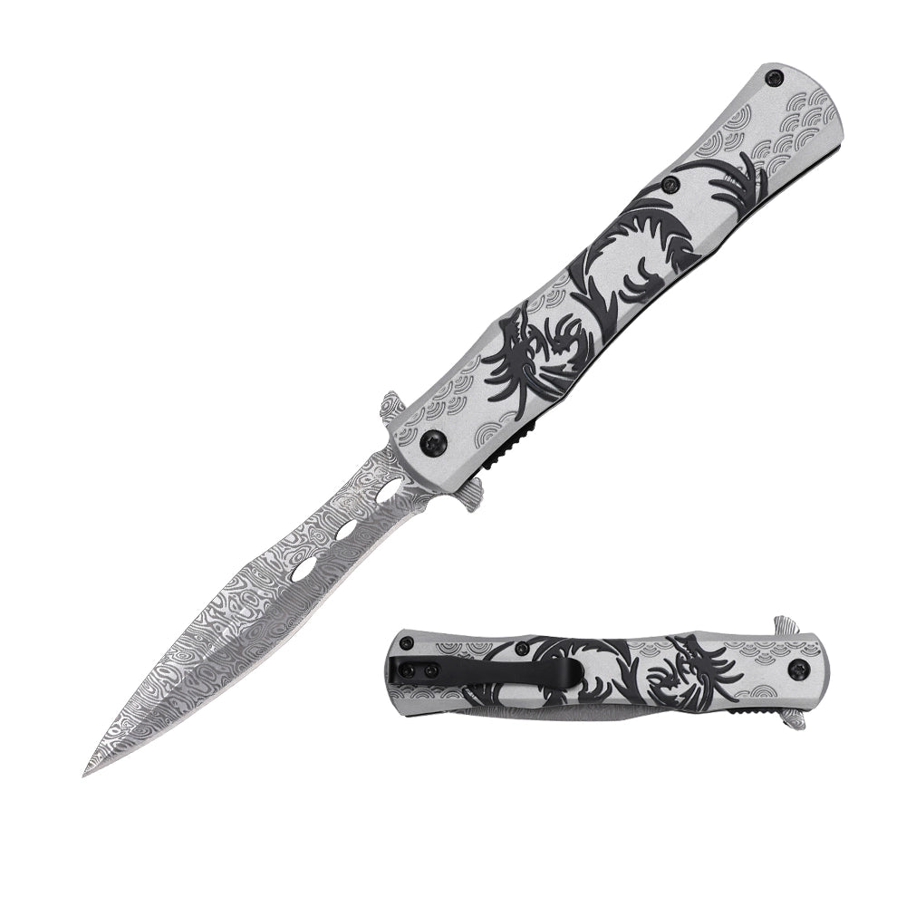 Dark Side Blades Spring Assist Liner Lock Knife Etched 3Cr13Mov Blade/Silver Aluminum Handle with Black Dragon Design SKU DS-A2001BK