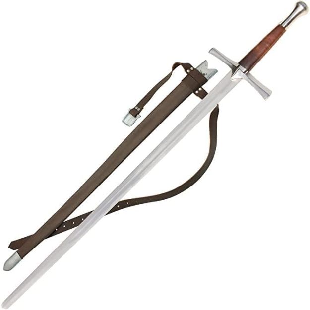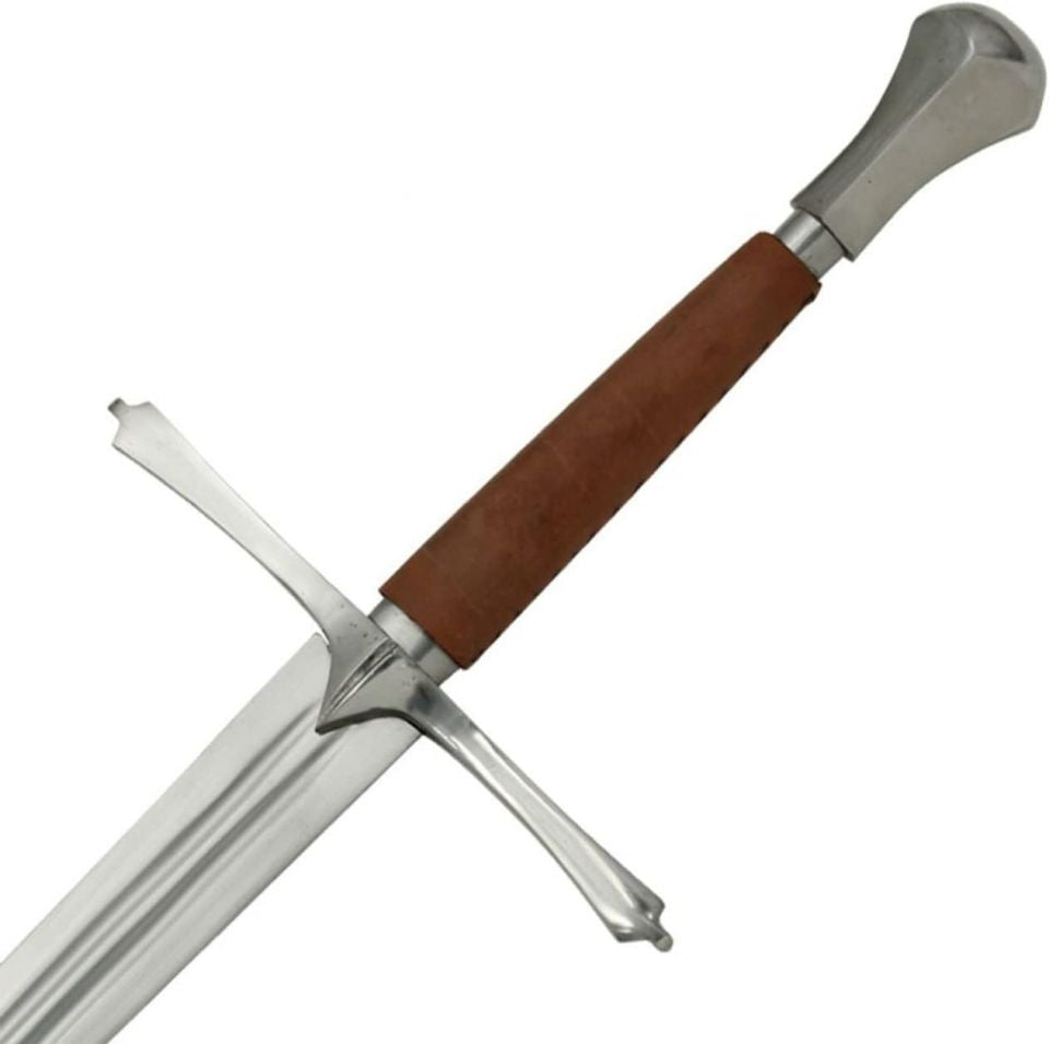 Medieval Warrior Handmade Late Middle Ages Hand and A Half Sword w/Sheath High Carbon Steel Blade/Leather Wrapped Wood Handle with Silver Cross Guard and Pommel 46" Overall SKU TC-5103