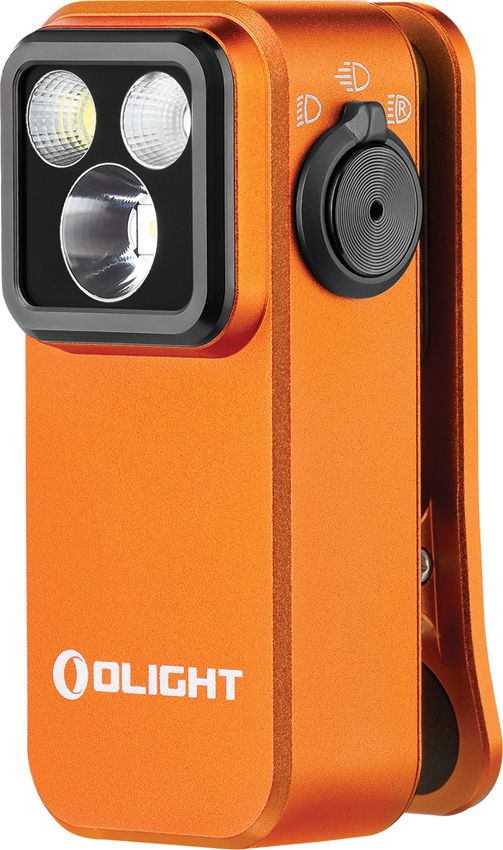 Dimensions: 2.25" x 1.1". SOS strobe. Strobe. Water resistant. Impact resistant. Clip. Rechargeable. Side switch operation. White and red LEDs. USB-C charging. 120m beam distance. Modes: Floodlight-Turbo (500-300-100 lumens, 1+50+30m runtime); High (300-180-100 lumens, 1+100+10m runtime); Medium (100 lumens, 3.5h runtime); Low (10 lumens, 27h runtime); Moon (1 lumen, 144h runtime); Spotlight-Turbo (380-240-85 lumens, 1+50+30m runtime); High (240-150-85 lumens, 1+100+10m runtime); Medium (85 lumens, 3.5h runtime); Low (9 lumens, 27h runtime); Moon (1 lumen, 144h runtime); Red (40 lumens). Glass lens. Requires (1) Lithium battery (included). Aluminum construction. Color: Orange.