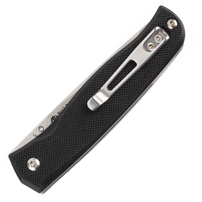 3.75" (9.53cm) closed. 2.88" (7.32cm) satin finish Sandvik 14C28N stainless blade. Black G10 handle. Thumb stud. Pocket clip. Boxed.