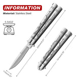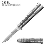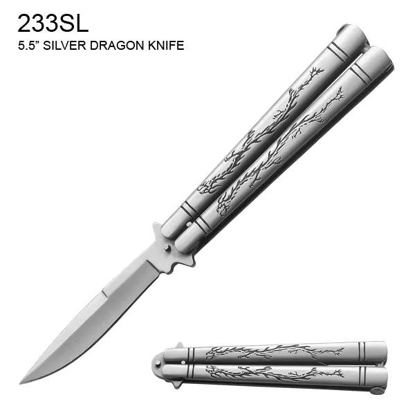SILVER DRAGON BUTTERFLY KNIFE5″ CLOSED, 8.75″ OVERALL.STAINLESS STEEL BLADE & HANDLE