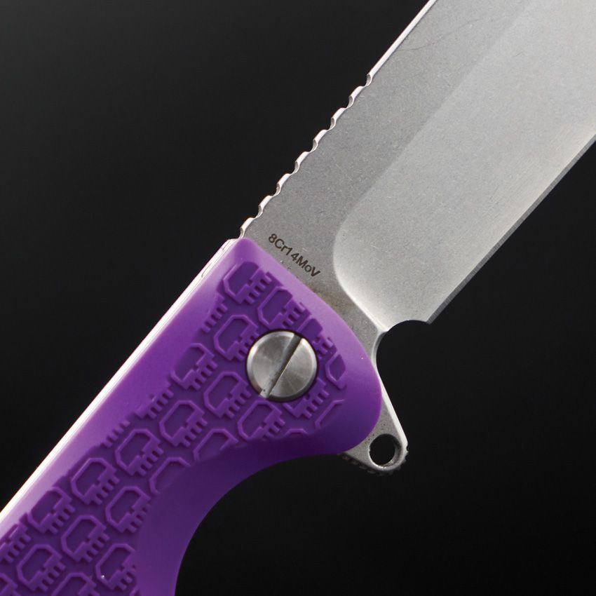 4.5" (11.43cm) closed. 3.25" (8.26cm) stonewash finish 8Cr14MoV stainless clip point blade. Purple textured ABS handle. Extended tang. Glass breaker. Pocket clip. Lanyard hole. Boxed.