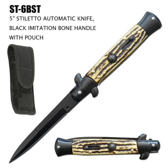 Italian Milano Stiletto Switchblade Knife Black 440 SS Blade/Faux Bone Handle SKU ST-6BST