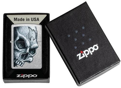 Skull and Flame Street Chrome Zippo Lighter The iconic Zippo® lighter, trusted for generations. Featuring the unmistakable Zippo “click,” this windproof lighter is built to perform virtually anywhere. With its all‑metal construction, refillable design, and lifetime guarantee, it’s more than a lighter it’s a piece of American heritage. ✨ Features & Benefits - Authentic Zippo® Quality – Genuine windproof lighter with the signature Zippo “click.” - Durable All‑Metal Build – Designed for reliability and long‑lasting use. - Windproof Flame – Works virtually anywhere, even in challenging conditions. - Refillable for Life – For best performance, use genuine Zippo fuel, flints, and wicks. - Made in the USA – Backed by Zippo’s famous lifetime guarantee: “It works or we fix it free™.” 📐 Specifications - Fuel: Zippo lighter fuel (sold separately) - Height: 2.25″ - Width: 0.5″ - Depth: 1.5″ - Weight: 2.0 oz. 📦 Packaging & Compliance - Packaging: Retail‑ready Zippo branded box - Important Note: Zippo® branded produ