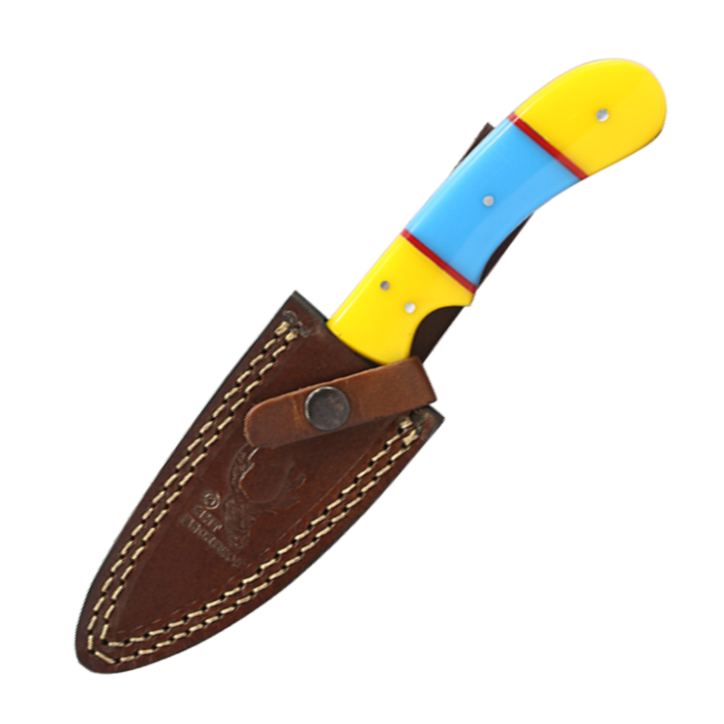 The Bone Edge 8" Handmade Full Tang Hunting Knife w/Leather Sheath Damascus Steel Blade/Yellow & Sky-Blue Resin Handle SKU 14517