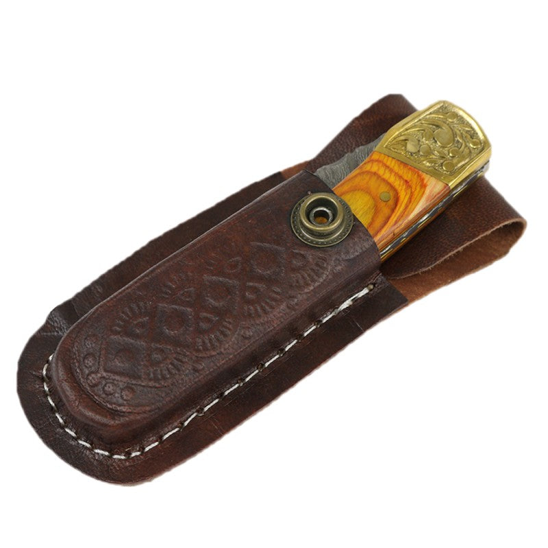 The Bone Edge Handmade Folding Knife w/Leather Sheath Damascus Steel Blade/Natural Color Wood Handle with Brass Accents SKU 13614